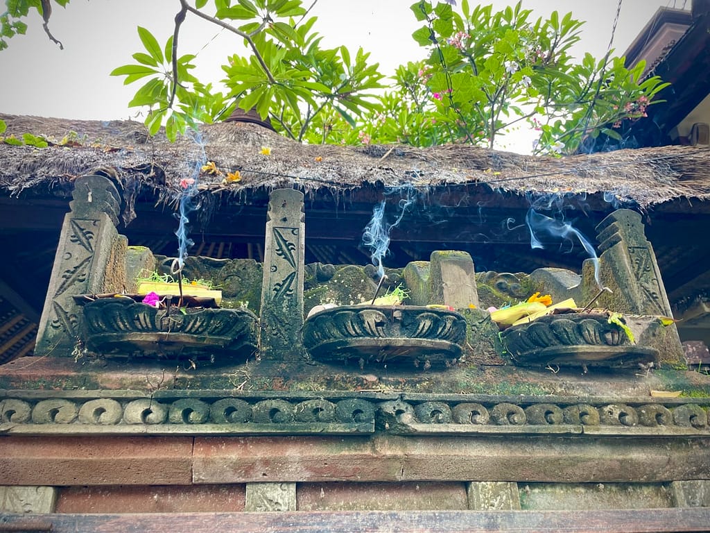 Nie ma tego na Gili, ale na Bali mieszkańcy codziennie robią niezliczoną ilość tacek-stroików, które rozkładają przed swoimi domami, sklepami, na środku chodnika, na gzymsach i ofiarowują opiekuńczym duchom albo bogom. Umieszczają na nich świeże kwiaty, ziarenka ryżu, czasem ciasteczka, a nawet papierosy! Obowiązkowo palą kadzidła, od których ulice pachną. Przypomina to słowiańskie obrzędy, podczas których bogów częstuje się miodem pitnym i chlebem – rozlewając lub paląc.