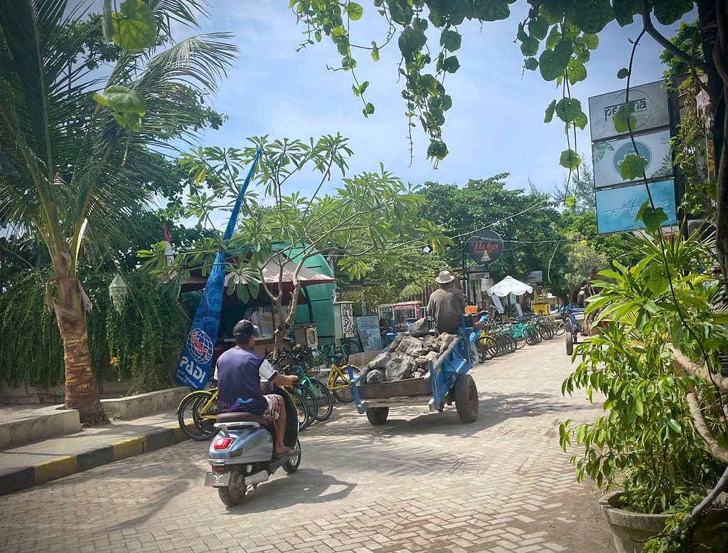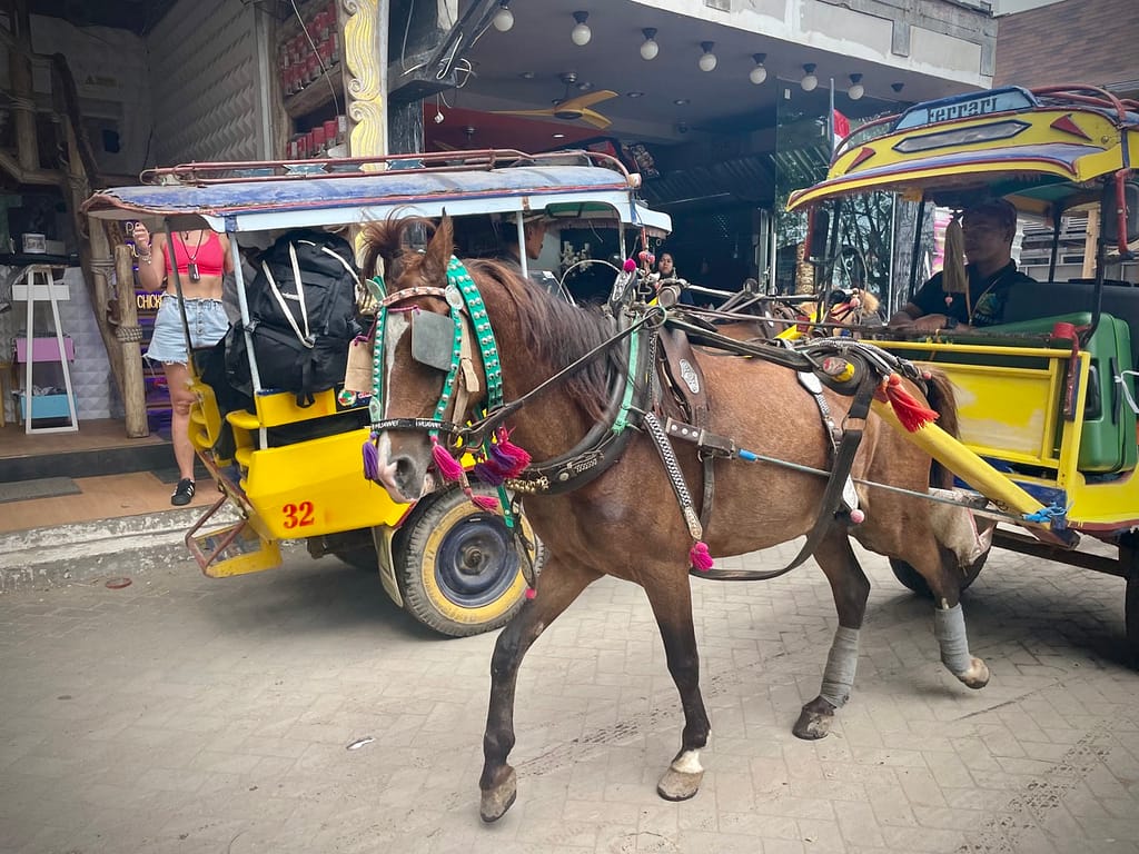 Na wyspach Gili nie są dopuszczalne pojazdy silnikowe. Mimo, iż wyspy są malutkie, a do każdego hotelu z portu można dojść pieszo w maksymalnie kilkanaście minut, stałą częścią krajobrazu są jednokonne zaprzęgi, które, gdy wiozą turystów z bagażami, zawsze poruszają się szybkim kłusem. Koński transport służy również do przewożenia takich towarów jak ogromne głazy, baniaki z wodą czy butle z gazem. Konie pracują w ponad 30 stopniowym upale, zaprzęgnięte po kilkanaście godzin na dobę. Są mocno wychudzone i koślawe. Wszystkie mają spienione pyski, mocno podciągnięte wędzidła i klapki na oczach. Są, a jakby ich nie było. Niektóre mają wywalone bokiem języki albo kagańce. Wygląda na to, że Morskie Oko to przy tym pikuś.