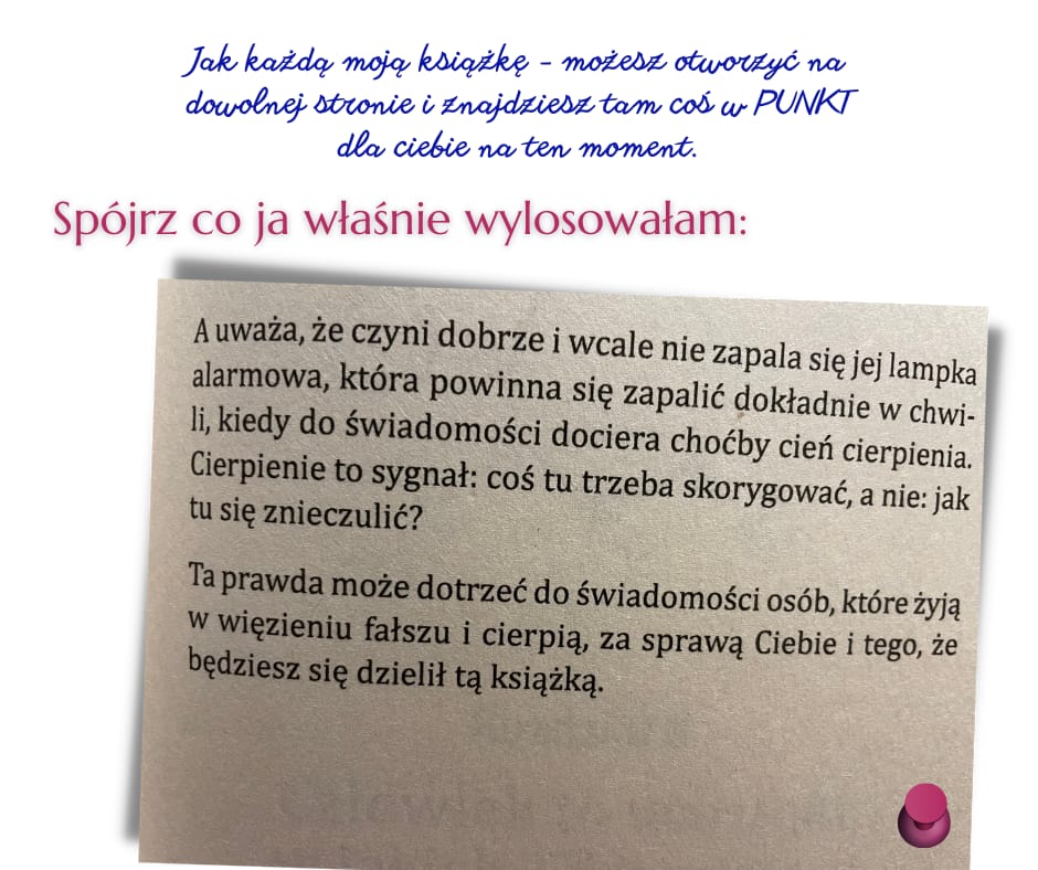 Czuję, że otrzymałam kompas, z którego korzystam od już. Po lekturze zobaczyłam trud “trzymania się za pysk”, w ogóle tony przewrotnej mojej logiki i poczułam zmęczenie. Totalne. Nad ranem poszłam spać i pozwoliłam sobie wbrew wszystkiemu na sen do ponad 14 godziny, bez wyrzutów.