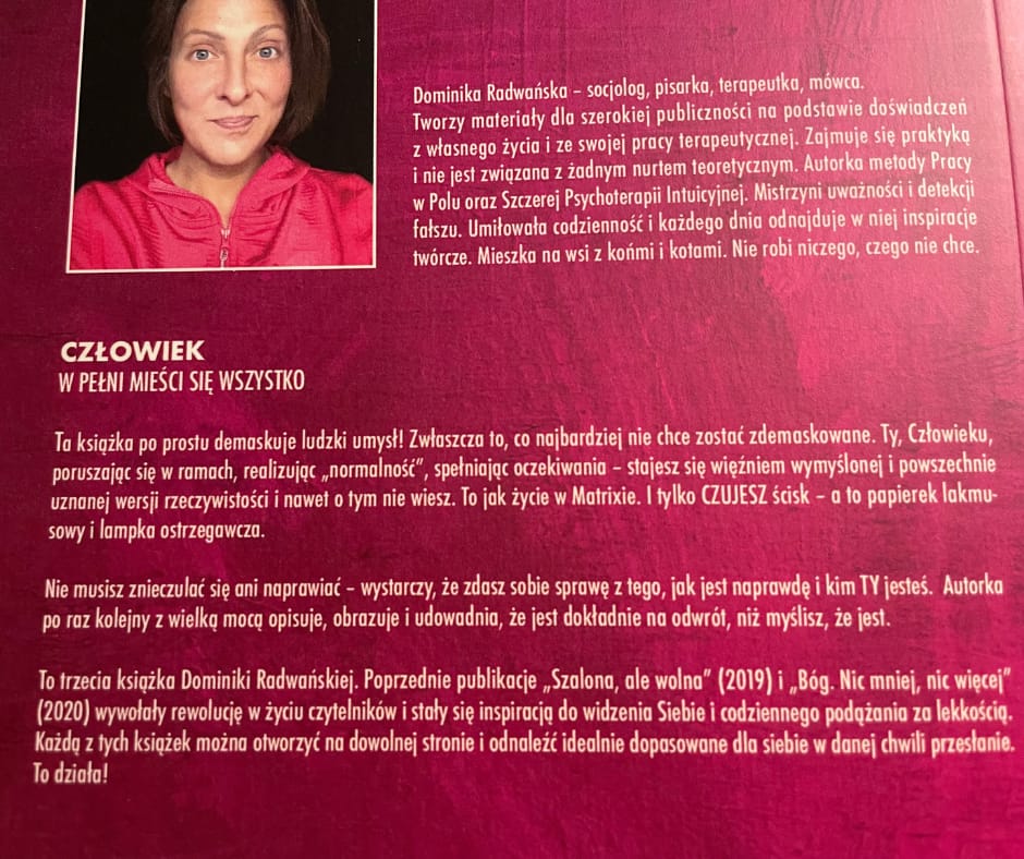 To trzecia książki Dominiki Radwańskiej. Poprzednie publikacje „Szalona, ale wolna” (2019) i „Bóg. Nic mniej, nic więcej” (2020) wywołały rewolucję w życiu czytelników i stały się inspiracją do widzenia Siebie i codziennego podążania za lekkością. Każdą z tych książek można otworzyć na dowolnej stronie i odnaleźć idealnie dopasowane dla siebie w danej chwili przesłanie. To działa!